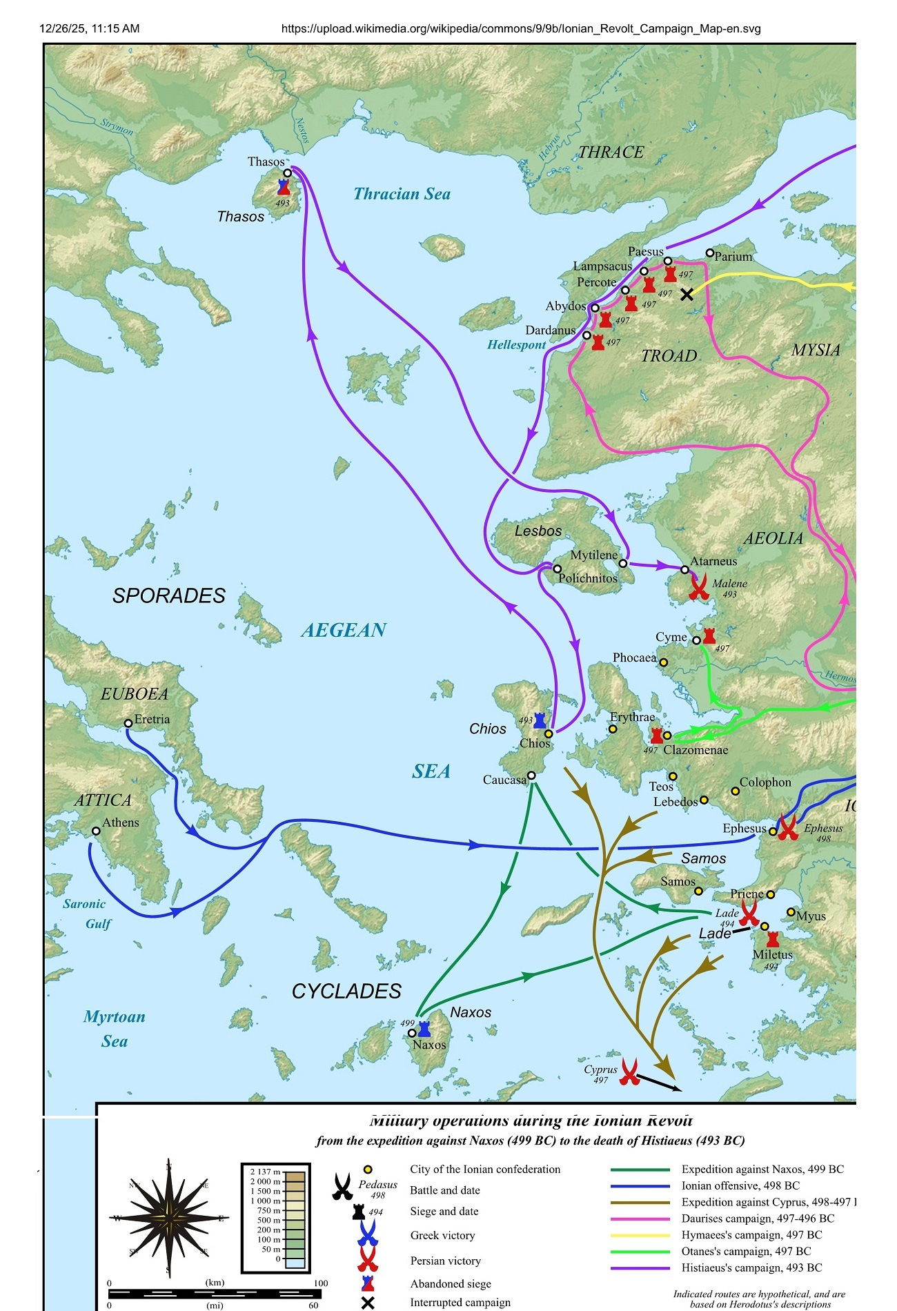 2026 Arriving “In 493 BCE, the Ionian Revolt ended with the Persian Empire crushing the last Greek resistance in Asia Minor, sacking cities like Miletus and imposing rule after years of rebellion (499-493 BCE). This suppression solidified Persian control over Ionia and directly led to Persia’s first major invasion of mainland Greece starting the following year, as Persian King Darius I sought to punish Athens and Eretria for aiding the revolt. In Rome, the Latin War concluded, with Rome securing dominance in Latium through treaties like the Foedus Cassianum, while the plebeians’ secession also ended.”